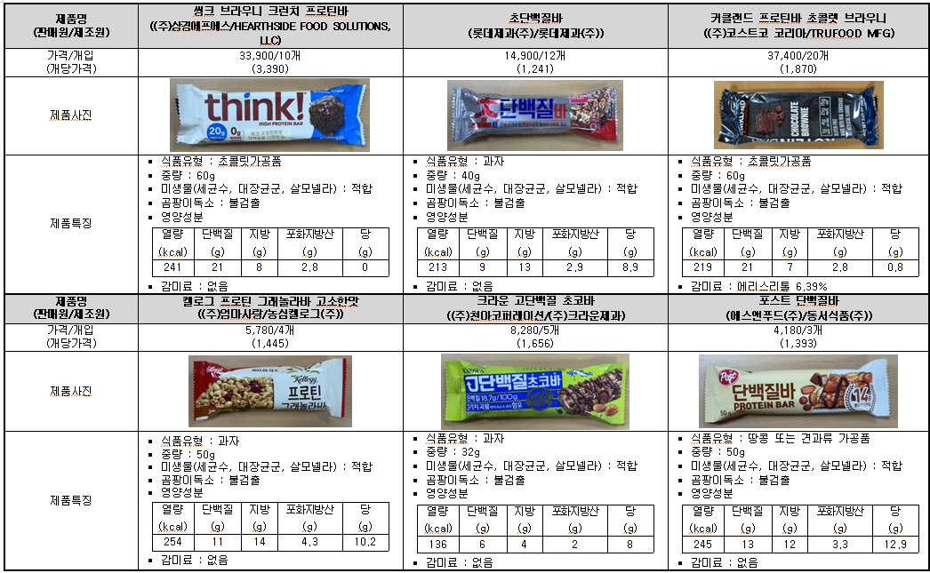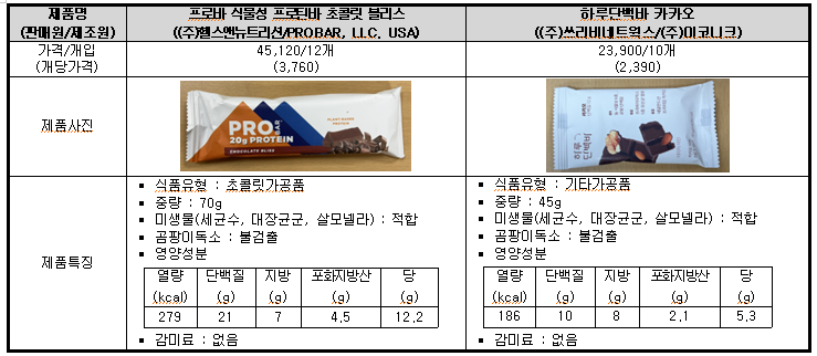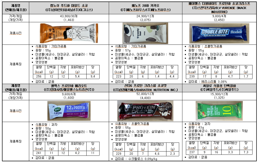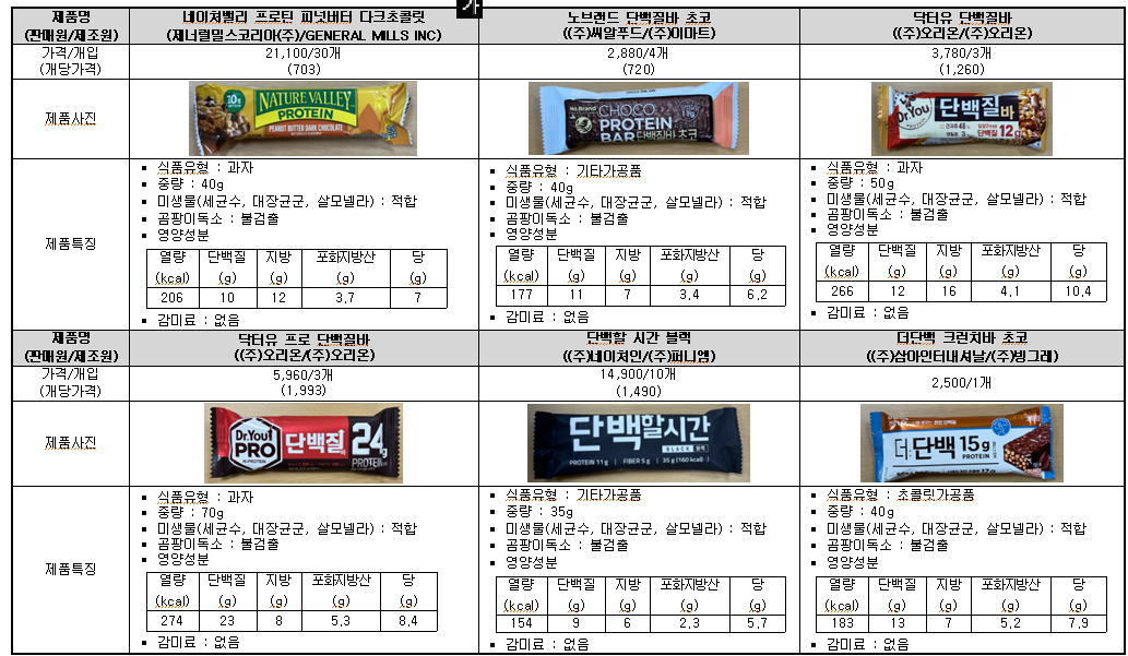 ㅇ 조사대상 제품 1개당 단백질 함량은 최소 6g(1일 영양성분 기준치 대비 10.9%) ~ 최대 23g(1일 영양성분 기준치 대비 41.8%)으로 제품 간 최대 3.8배 차이가 있으므로 제품의 영양정보란을 확인한 후 제품을 선택하는 것이 필요함